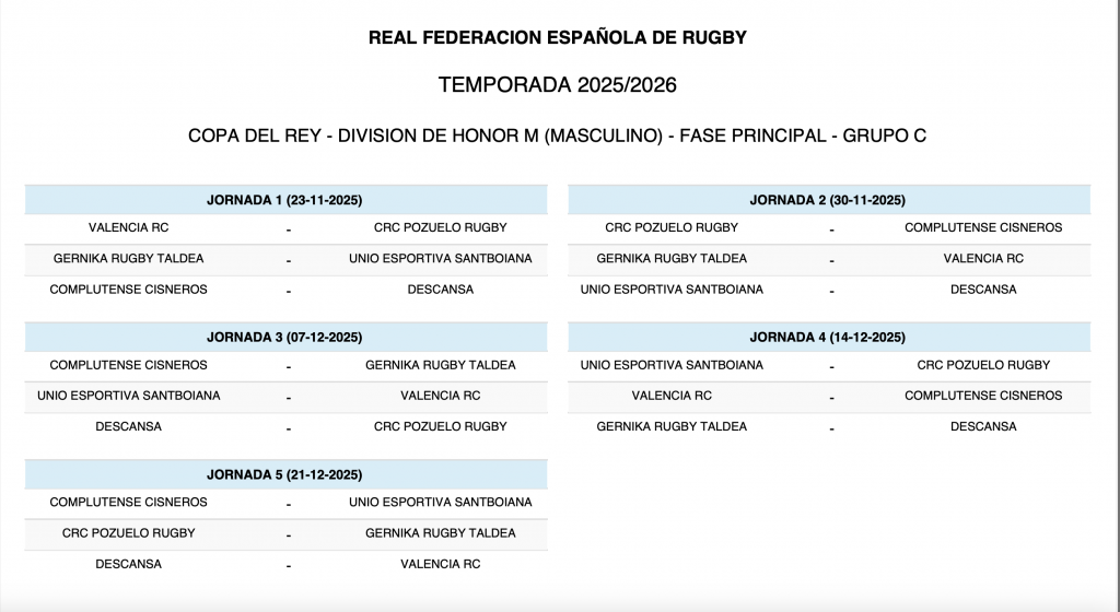 Grupo C: Complutense Cisneros, UE Santboiana, Valencia RC, Gernika RT y CRC Pozuelo.