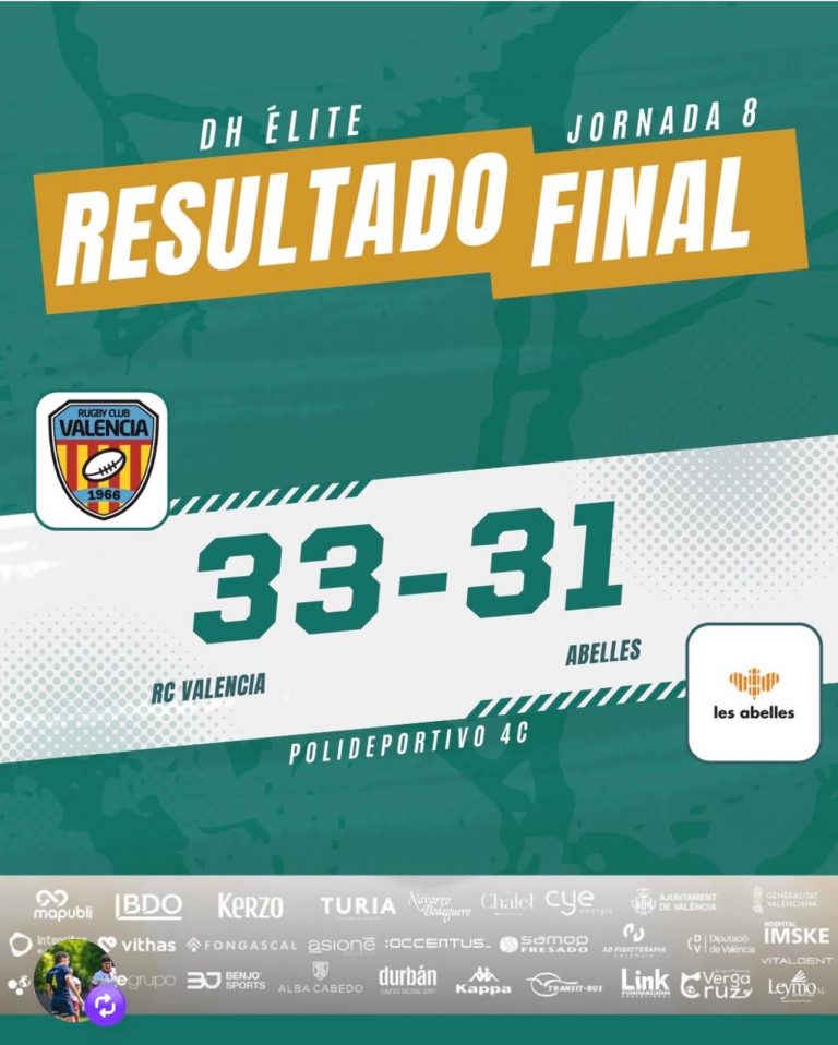 El Rugby Club Valencia logró una victoria de enorme valor ante Fibra Valencia Les Abelles por 33-31 en el Polideportivo Quatre Carreres, en un derbi intenso, abierto y cargado de alternativas que se decidió en los minutos finales. El encuentro confirmó la capacidad competitiva de ambos conjuntos valencianos, que supieron sufrir, reaccionar y golpear